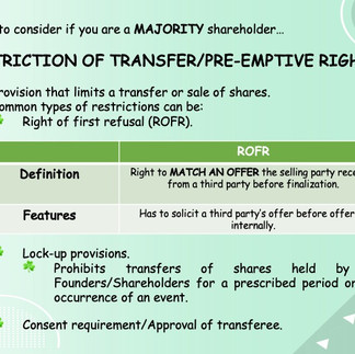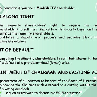 SHAREHOLDERS AGREEMENT (MAJORITY & MINORITY)Sean C.Nov 3, 20251 min readWhat are pointers to consider under a Shareholders agreement? Swipe to find out!